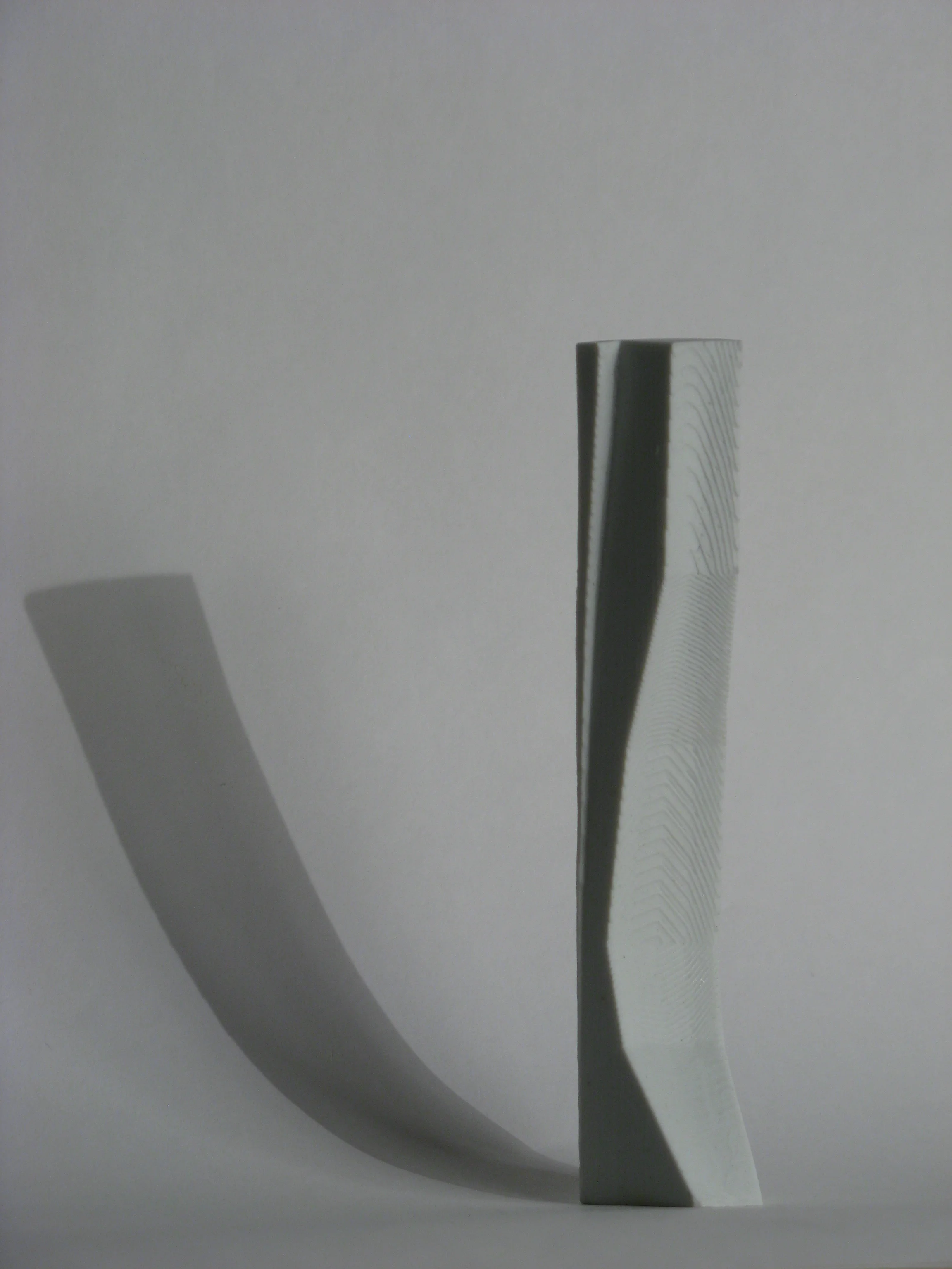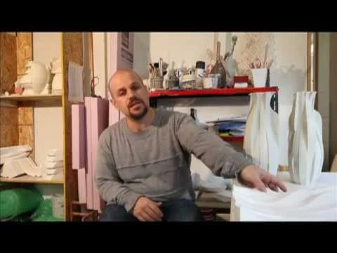 The mold is designed on the computer and then a negative is produced by a computer-controlled milling machine. Into this negative I cast plaster to create the actual production mold. I then use the plaster mold to cast porcelain vases. Unlike traditional casting here the arrangement of the mold pieces is alternated each time to produce a one-of-a-kind vase. Each piece of the mold carries a number or letter stamp, and so in each cast a unique ID number is stamped on the vase, I record these ID numbers to make sure I never make the same piece twice.